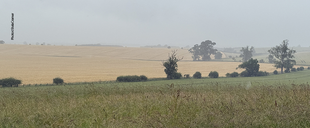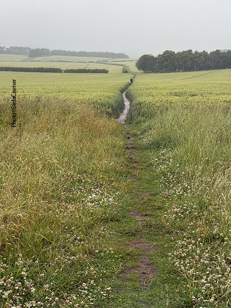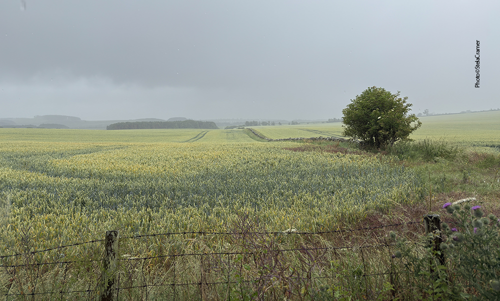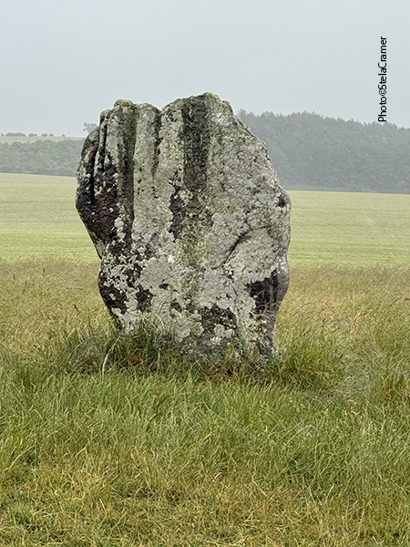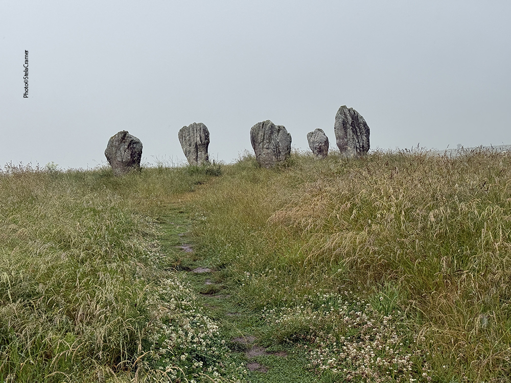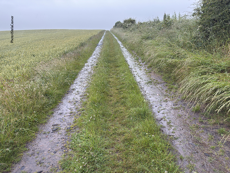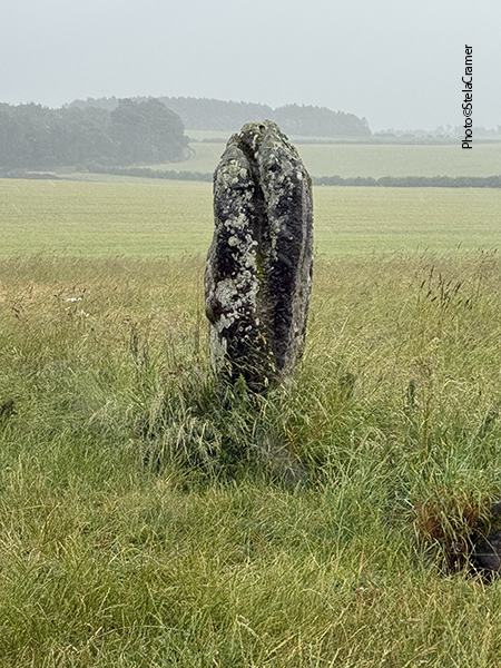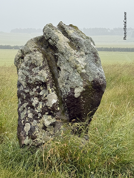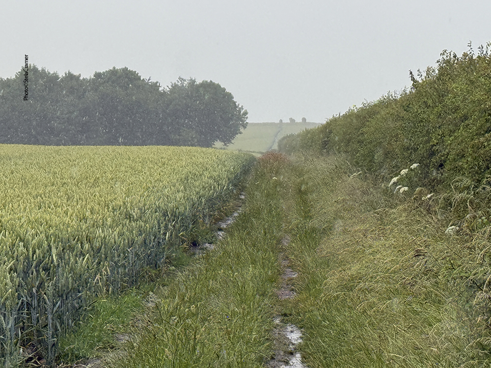 Half a mile later, when the sign for the footpath finally appeared, I was soaked. The rain always find its way into one’s clothes and shoes. At first you can’t see the stones; actually all I could see through rain and mist was wheat, both sides of the track. And mud. Half a mile ahead, my socks had turned into sponges, sploshing in the puddles inside my shoes. But after a slight turn, the stones silhouette could be seen in the horizon. Far away. But so far, I was happily singing Supertramp’s It’s Raining Again.