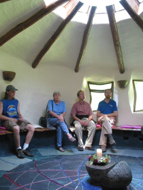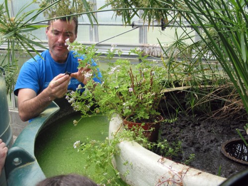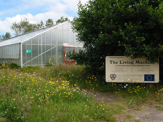 The Brazilians were updating me on activities and events. That afternoon, a guided tour to the Foundation was scheduled and it included the Living Machine, an ecological water treatment station which technology had caught my interest. To join the group I paid a two pounds fee. After visiting the facilities, studios, and meditation rooms including the Nature Sanctuary, we got in the Living Machine. It was a massive greenhouse containing a series of tanks where sewage arrives through pipes. “Diverse communities of bacteria, algae, micro-organisms, numerous species of plants and trees, snails, and fish interact as whole ecologies in each one of these tanks and biofilters. These mirror processes that occur in the natural world, but do so more intensively. At the end of the series of tanks, the resulting water is pure enough to discharge directly into the sea or to be recycled. The technology is not only capable of meeting tough new sewage outflow standards, but uses no chemicals, and has a relatively inexpensive capital cost attached.” (quote from Findhorn Foundation Website)