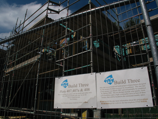 Construções ecológicas: para cada duas ou até três casas da Ecovila há uma área comum de cozinha e lavanderia (nesta casa, a parte central preta), minimizando o impacto ambiental. Emprega-se material reciclado e certificado, conforme detalhado na placa da obra. / Ecological buildings: each two or even three houses in the Ecovillage share facilities (laundry, kitchens – here, the black wal lin the middle ) avoiding unnecessary duplication, minimizing ambiental impact. All supplies are recycled and certificated, as stated in the sign shown below.