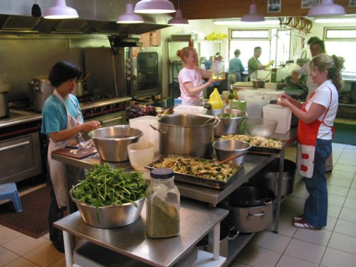 Dia 9 de julho de 2005 trabalhei como voluntária na cozinha da Fundação. Como foi bom descascar ervilhas e cebolas, mexer com facas e panelas. Estava com saudade disso, e o trabalho também me valeu o delicioso almoço. No dia seguinte, eu teria de pagar para almoçar, por isso só entrei no salão de refeições para falar com os brasileiros no fim do horário de refeição. Reparei, no entanto, que não havia mais ninguém pegando os vales de quem entrava. Todos já estavam acabando de comer, sobrara bastante comida nas travessas e eu estava faminta. Fiz um prato, sentei e comi. Felizmente, ninguém estranhou, nem tampouco veio me cobrar .