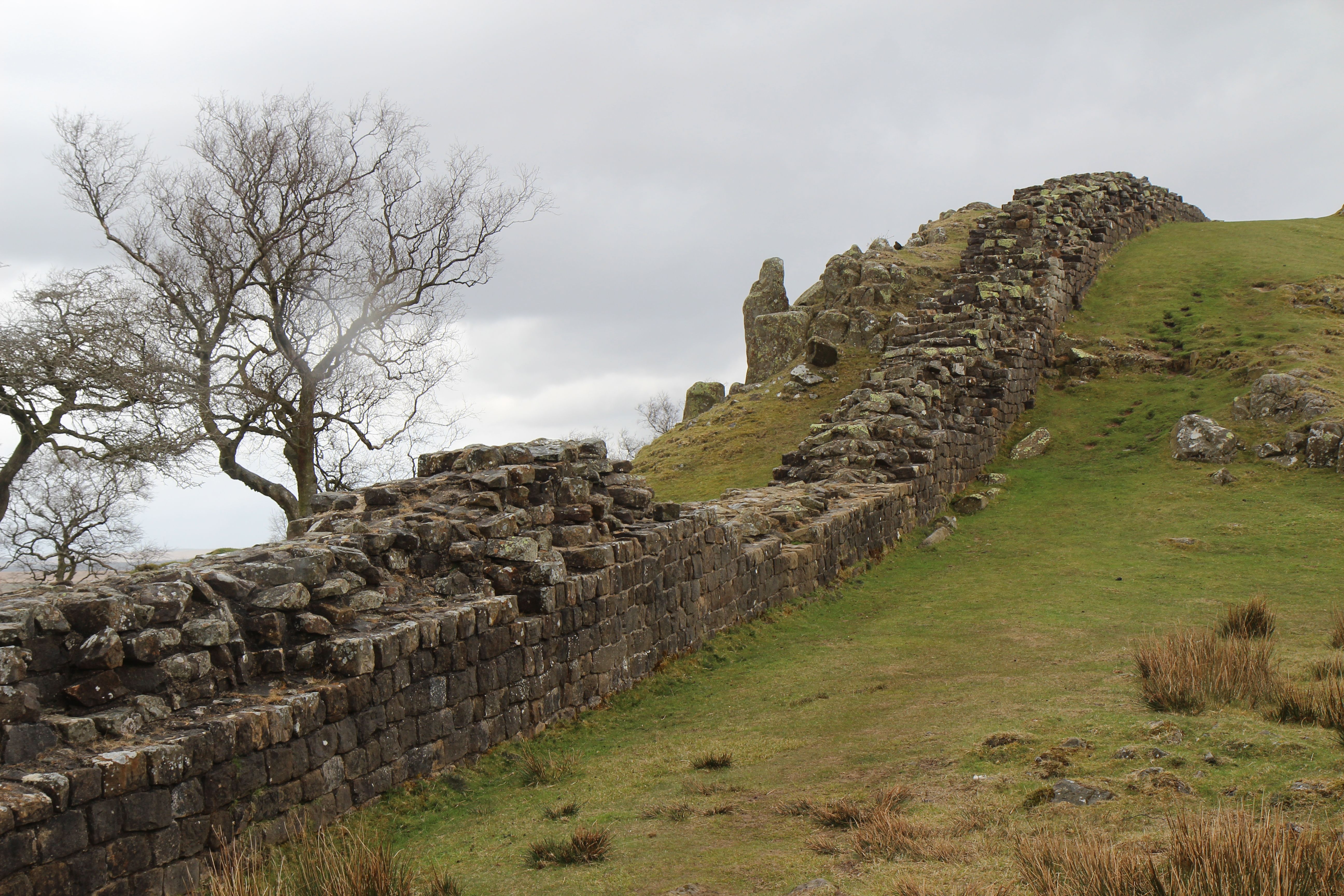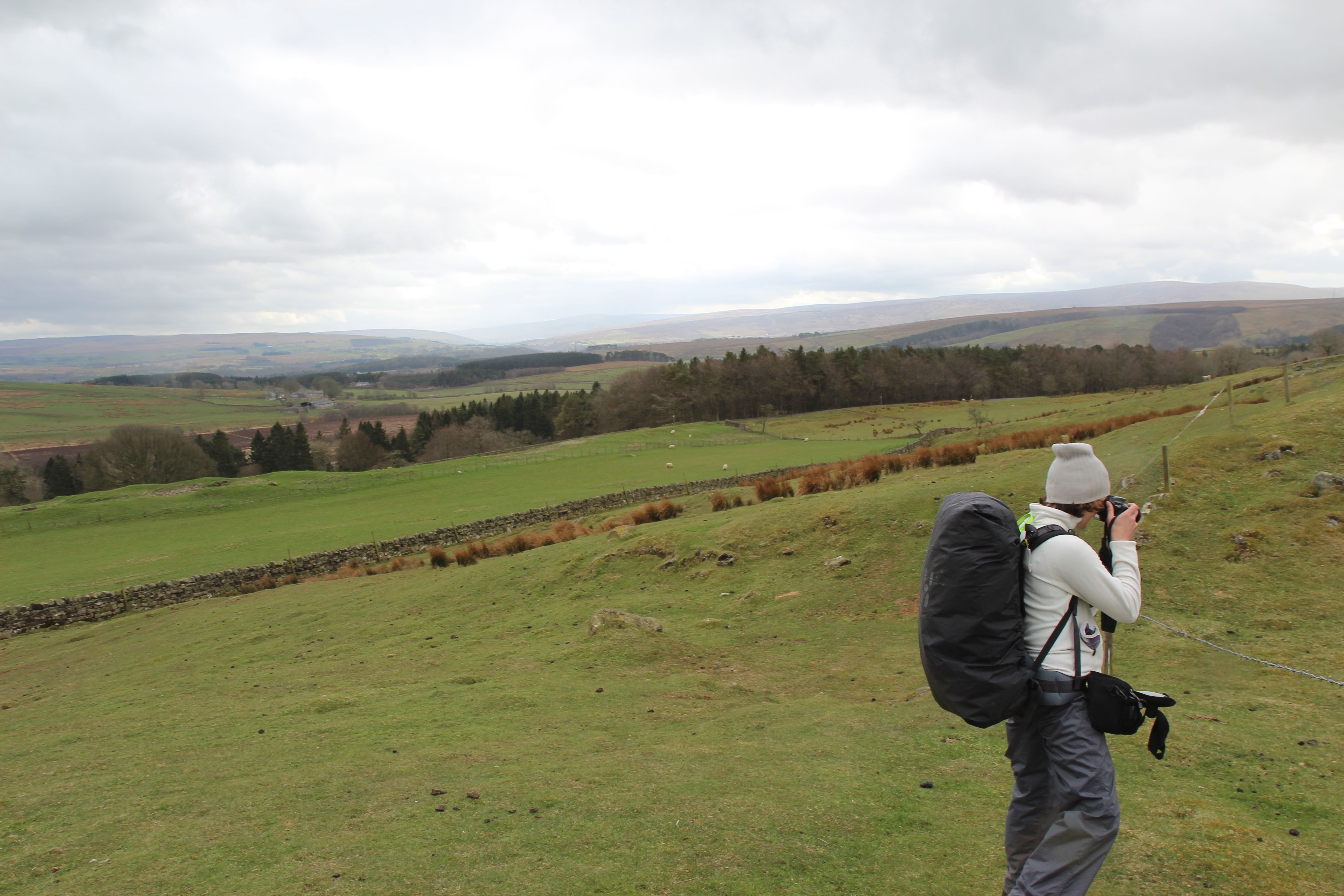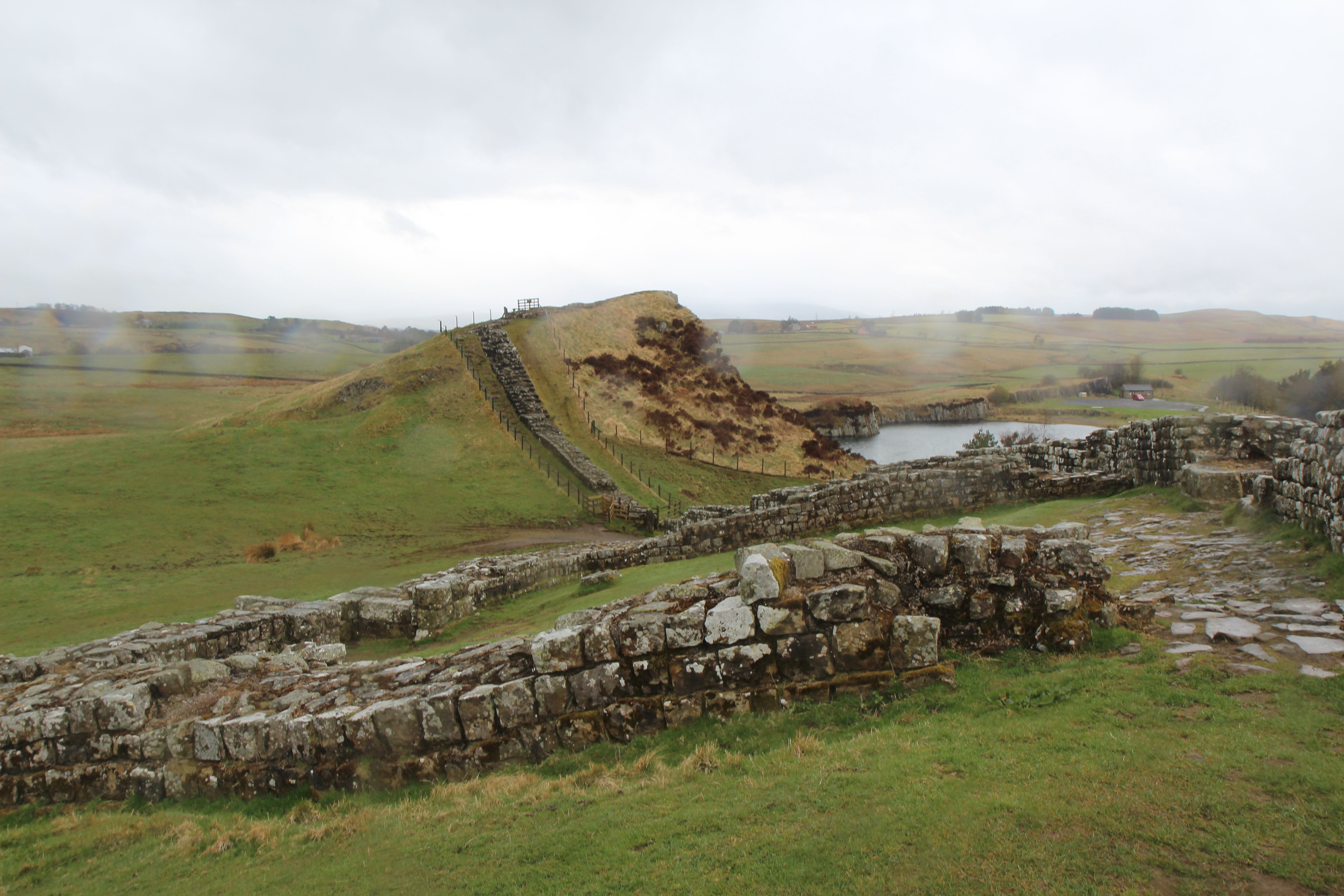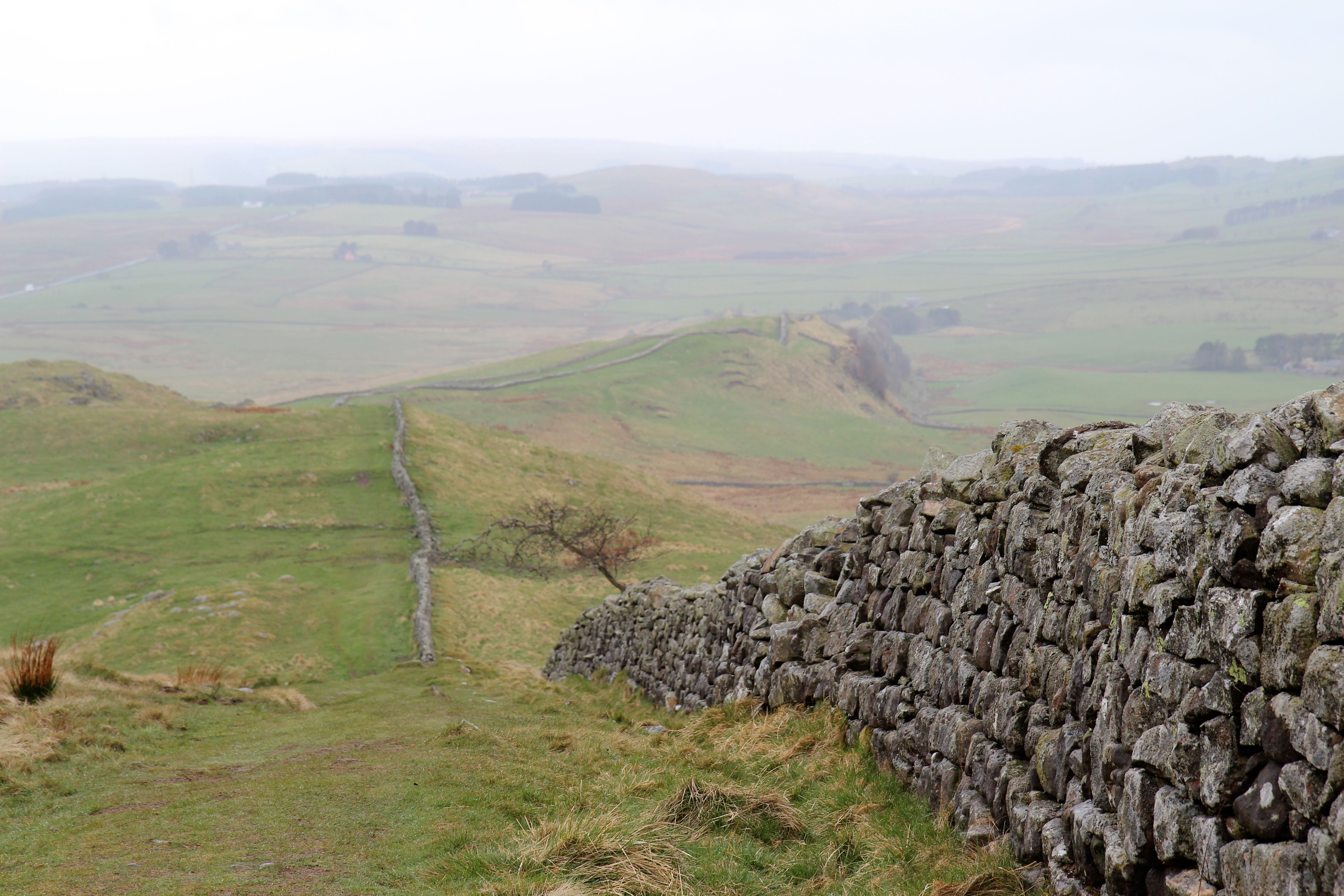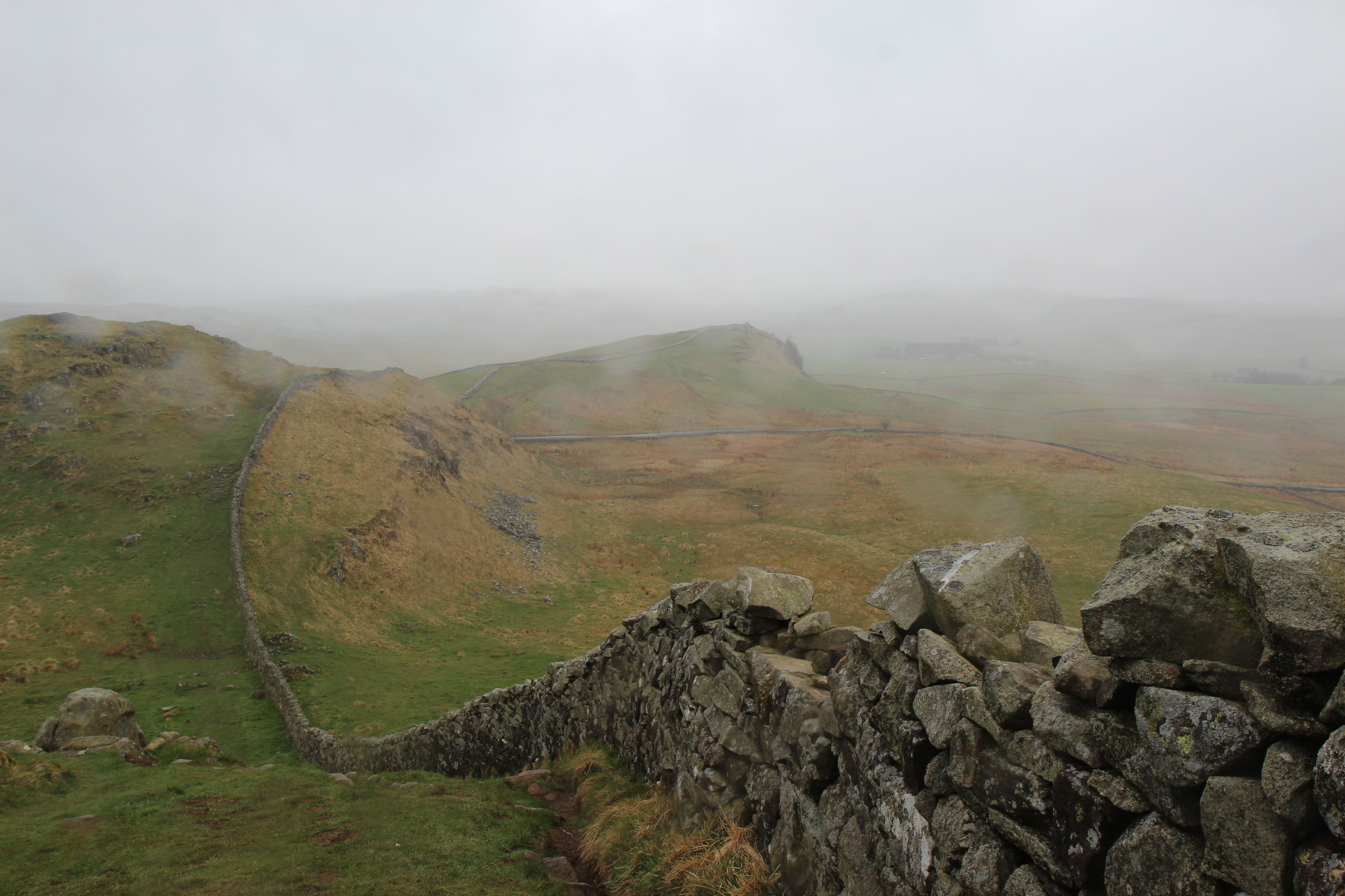 A desvantagem dessa estratégia seria caso eu fizesse alguma amizade, pois a pessoa iria seguir em frente e eu teria que voltar ao Greenheads. Mas isso não aconteceu. Não havia praticamente ninguém caminhando nessa manhã. O trecho entre o Twice Brewed e o Greenhead atinge a maior altitude da Muralha de Adriano, portanto o viajante fica exposto ao mais inclemente dos ventos. A paisagem é fantástica, mas assim que cheguei junto à Muralha, para retomar a trilha de onde tinha parado na véspera, a cor grafite das nuvens se liquefez. E começou a cair sobre minha cabeça.