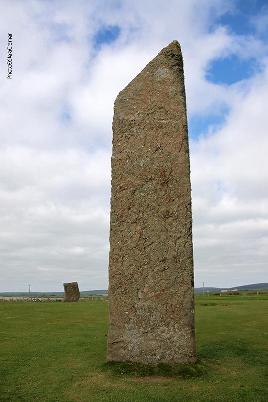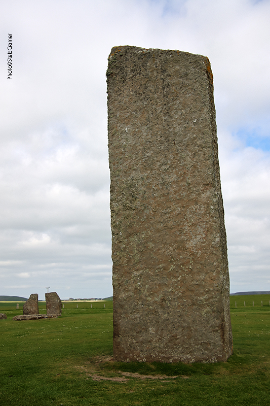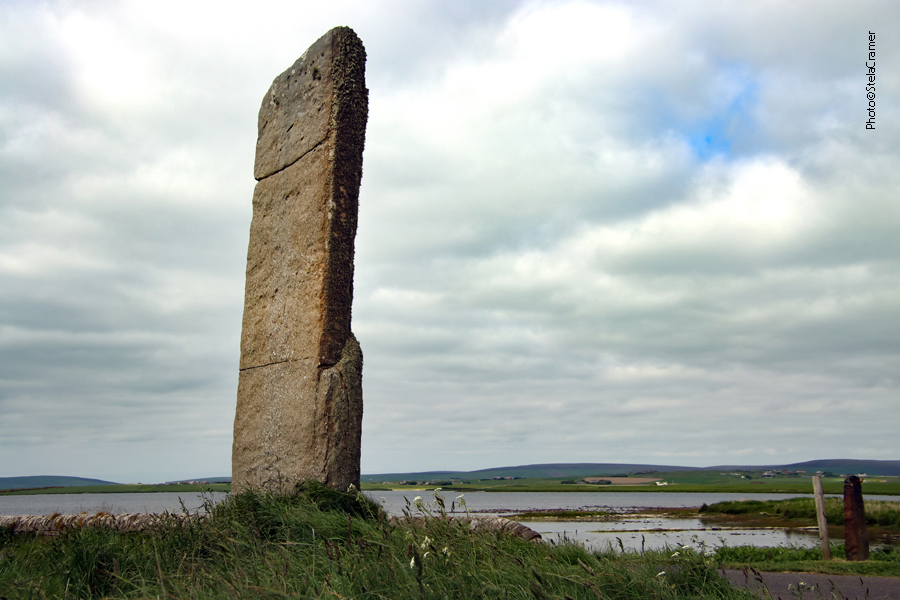 A Sentinela, às margens da lagoa (de água salgada) de Stenness. Do outro lado da estrada temos o lago de Harray, de água doce, o maior das Orkneys./ The Watchstone, by the shore of Loch of Stenness – a salt water (saline) lagoon. The freshwater Loch of Harray, on the other side of the road, is the largest loch of Mainland Orkney.