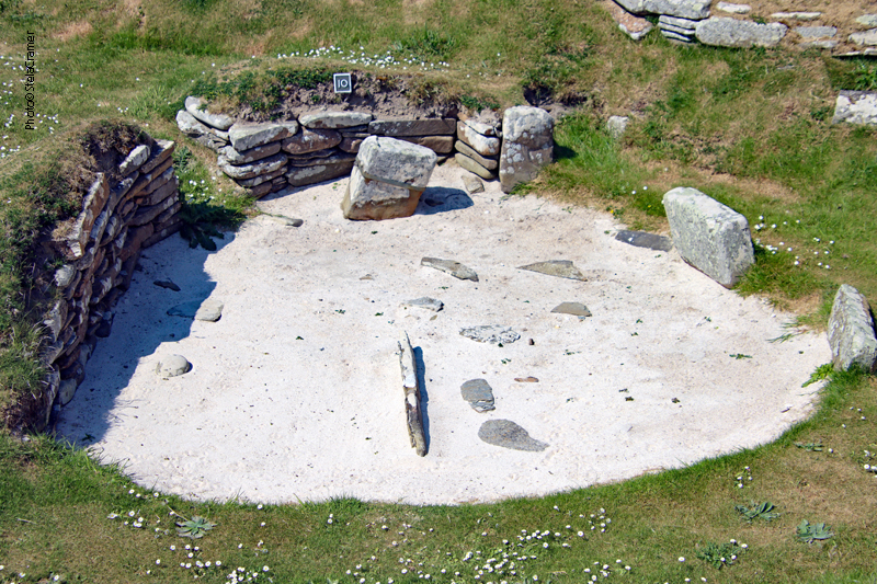 Na entrada da Estrutura 8 há um curioso arranjo estilo varanda com uma lareira; existe outra lareira no meio da estrutura, do mesmo tamanho e formato da que se encontra no centro do círculo de Stenness/ Structure 8 has an unusual porch arrangement with a fireplace at the entrance, and another hearth inside, identical in shape and size to the hearth at the centre of the Stenness Stones.