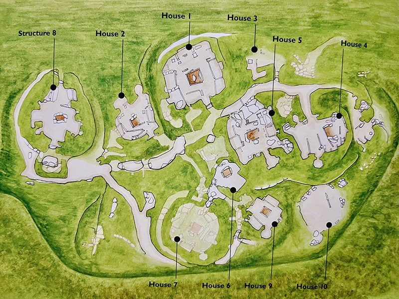 Lareiras, divisórias, camas e estantes estão praticamente intactas, e foram encontrados postes indicando a estrutura do telhado, que era provavelmente feito de madeira, palha ou turfa, por isso desintegrou com o tempo.