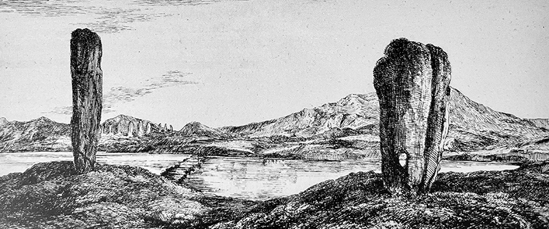 Ilustração do sec.18 mostrando a Pedra de Odin e a Sentinela, no caminho para ao Anel de Brodgar./ A 18th-century illustration shows the lost Odin Stone and the Watchstone, by the road to the ring of Brodgar.