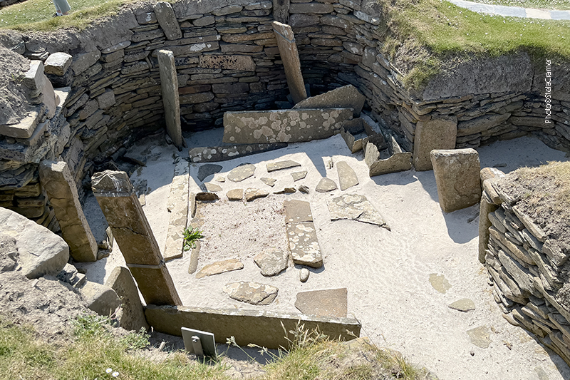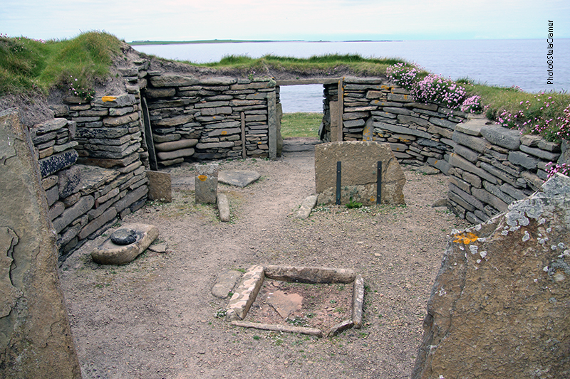 Esta fazenda Neolítica pode ser a mais antiga casa de pedra preservada do Norte da Europa. Datação por radiocarbono mostra que foi ocupada de 3700 a 2800 AC, isto é, antes das casas semelhantes em Skara Brae. / This Neolithic farmstead which may be the oldest preserved stone house in northern Europe.Radiocarbon dating shows that it was occupied from 3700 BC to 2800 BC, earlier than the similar houses in the settlement at Skara Brae.