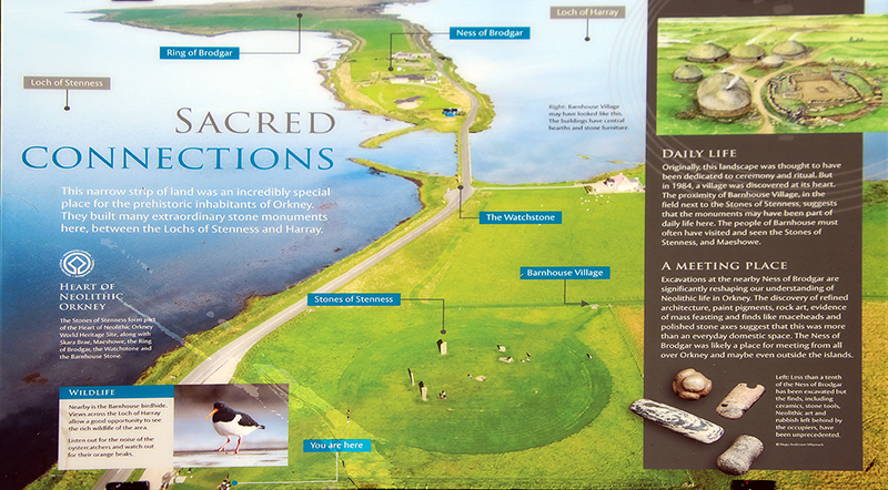 Placas informativas em Stenness. A de baixo mostra a conexão entre os monumentos, incluindo Barnhouse Village, que visitaremos a seguir. /Signs at the Stenness site. The one below shows how interconected the monuments were, including the Barnhouse Village, which we’ll visit next.