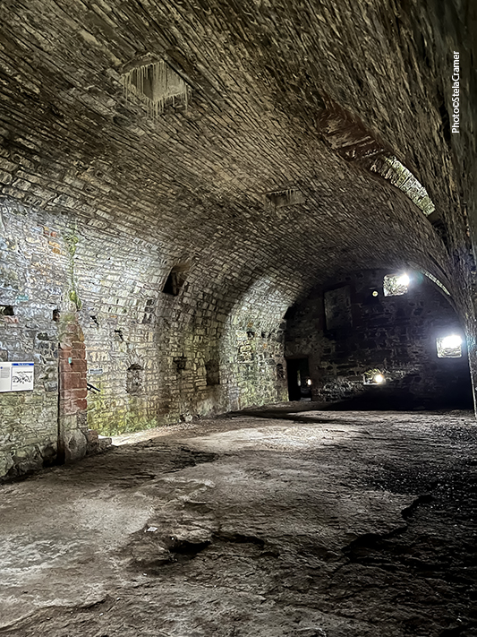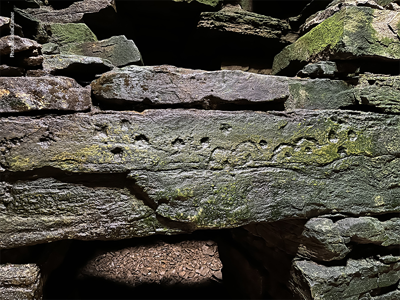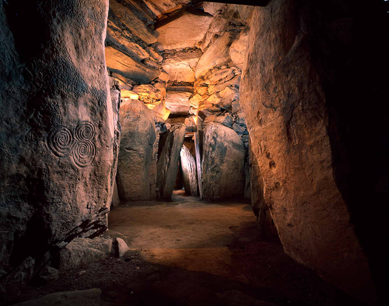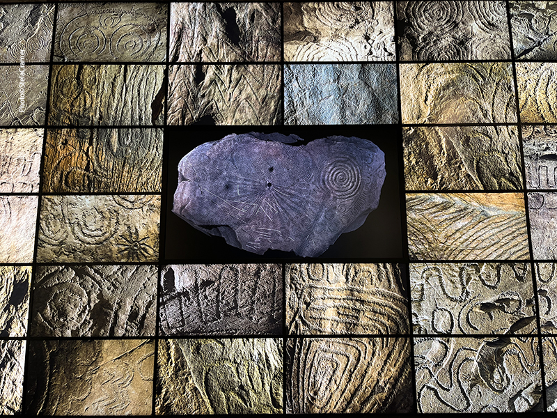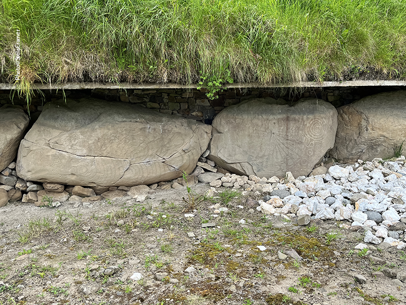 A imponente entrada com a pedra entalhada em “triskeles” – espirais triplas. Esta pedra mede cerca de 3 m de comprimento por 1,2m de altura, e pesa cerca de 5 toneladas. / The entrance passage and entrance stone’s triskele-like features, approximately three metres long and 1.2 metres high, and about five tons in weight.