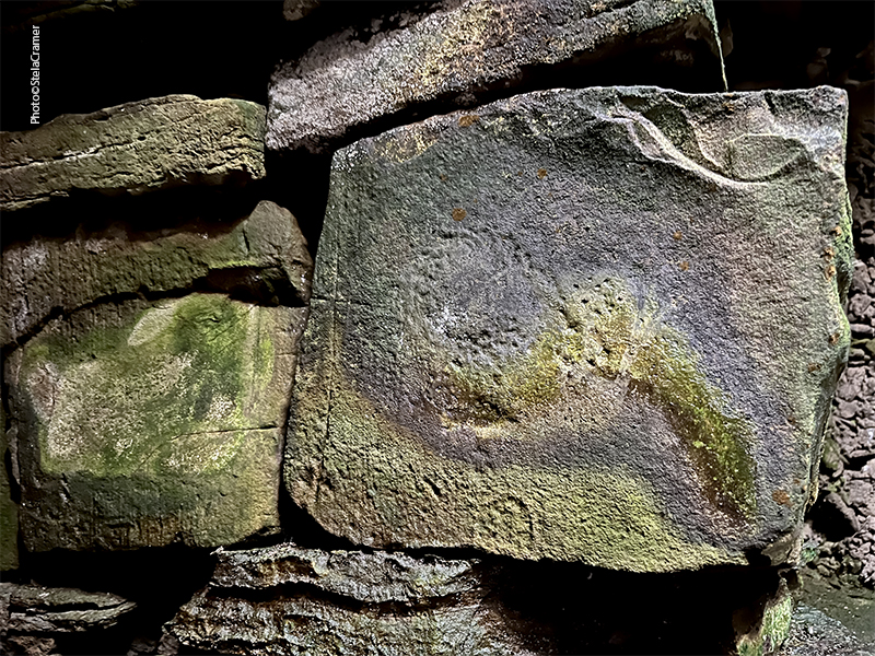 Muitas pedras tinham os desenhos ocultos, isto é, gravados na parte de baixo ou de trás das pedras. A lot of the art was hidden, i.e. carved onto the reverse or underside of the stones.