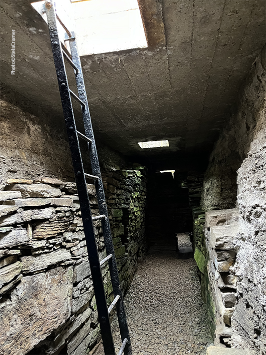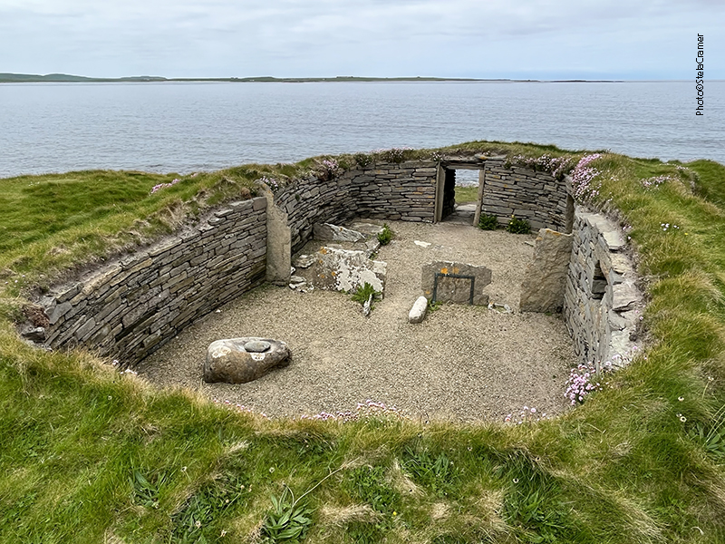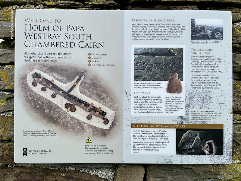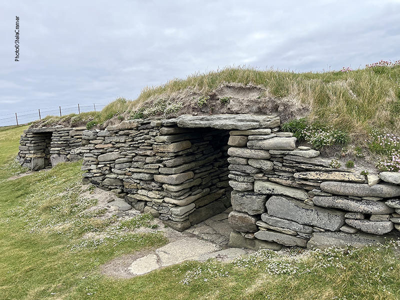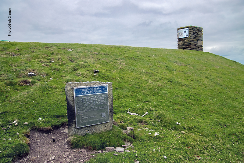 Holm of Papa Westray South chambered cairn is a well-preserved example of a “Maeshowe-type of Cairn”: a rectangular chamber entered at the side via a long passage, with cells leading off the chamber, several decorated stones and many very large blocks of stone used in the construction, carefully placed in certain locations, often using small pinning stones to precisely adjust their alignment and orientation. These monuments displays the skill of the Neolithic builders in both planning and construction. We’ll visit Maeshowe next.