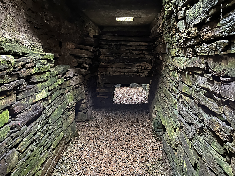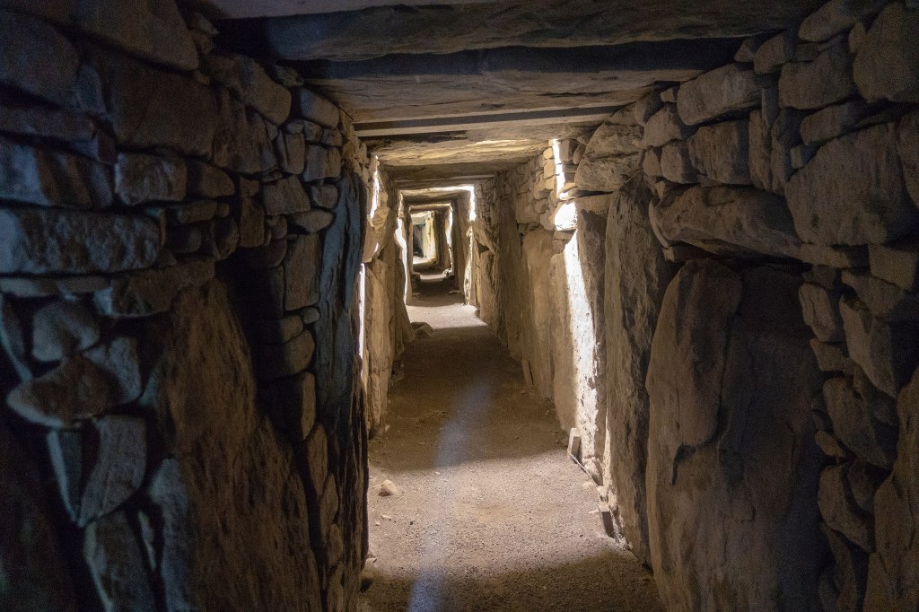 “Tumbas compartimentadas” como Maeshowe se caracterizam por uma passagem de entrada longa e baixa ( você não consegue entrar sem se abaixar) que leva a uma câmara principal, retangular ou quadrada, a partir da qual se pode acessar cubículos laterais. É o que se chama também de “ túmulo de passagem”, como Newgrange (na Irlanda), que veremos aqui a seguir. O alinhamento com o Solstício de Inverno, ou o de Verão, é uma característica desse tipo de construção. Mas em Maeshowe não foram encontrados restos humanos! Arqueólogos sugerem que o lugar era usado como observatório, calendário, ou mesmo para cerimônias, e não como túmulo… nunca saberemos ao certo.