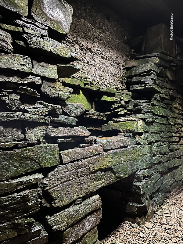 The chamber is constructed largely of flat slabs of stone, many of which traverse nearly the entire length of the walls. In each corner lie huge angled buttresses that rise to the vaulting. At a height of about 3 feet (0.91 m), the wall’s construction changes from the use of flat to overlapping slabs creating a beehive-shaped vault. Creating such a huge building must have been a major challenge for our remote ancestors, working without metal tools or powered machinery. It also clearly shows a tremendous social commitment.