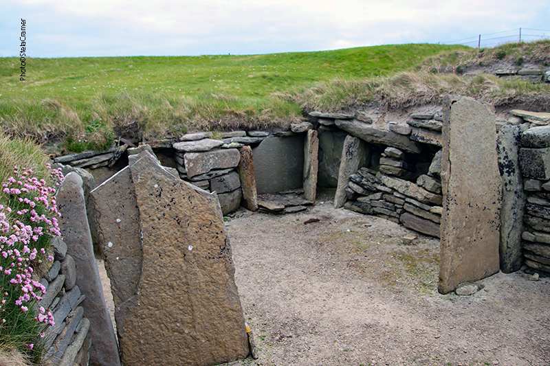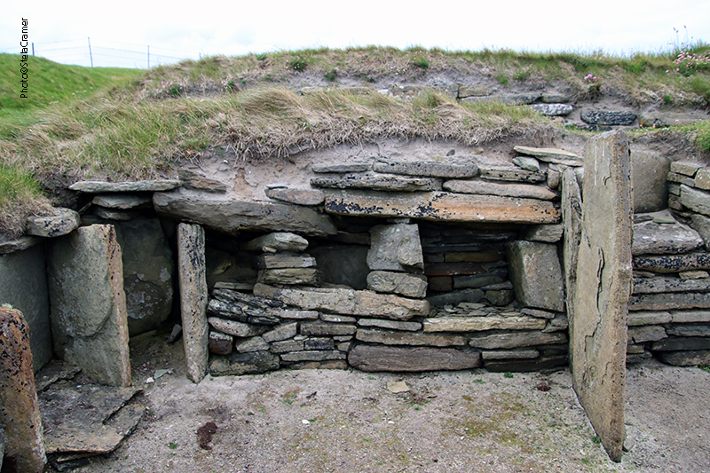 Back to Neolithic Heart of Orkney, we’ll visit Maeshowe chambered tomb, the finest in north-west Europe: one of the largest and most sophisticated in structure. Built around 5000 years ago, probably around 2800 BC, it marks the midwinter: for 3 weeks before and after the solstice (21 December, the shortest day of the year), the setting sun shines straight down the passageway into the tomb, illuminating the chamber at the back interior wall.