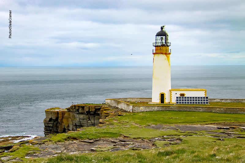 79 metros acima do nível do mar, o farol de Noup Head fica no alto de penhascos onde habitam milhares de pássaros. / 79 metres above sea level, Noup Head Lighthouse stands above cliffs that are home to thousands of birds.