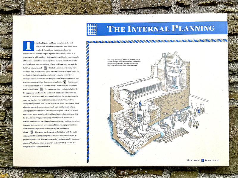 O Castelo impressiona por sua incomum arquitetura para defesa, tendo as paredes mais de 2 m de espessura. Construído no alto de uma colina, com visão total da Baía de Pierowall, qualquer pessoa ou grupo se aproximando do castelo seria avistado imediatamente. 71 seteiras possibilitavam atirar nos inimigos de todos os ângulos. Os andares de baixo não possuem janelas por onde invasores pudessem entrar. / The Castle is notable for its defensive architecture, unusual for the period, with 7 ft thick walls. Built on a slope overlooking Pierowall Bay, anyone approaching the castle, from any direction, would be spotted easily. 71 gunloops provided the opportunity to shoot at enemies from any angle. The lower floors, hav no accessible windows that could be exploited in an assault.