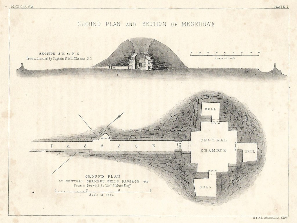 The mound encasing the tomb is 115 feet in diameter and rises to a height of 24 feet. Surrounding the mound, at a distance of 50 feet to 70 feet is a ditch up to 45 feet wide. The grass mound hides a complex of passages and chambers built of carefully crafted slabs of flagstone weighing up to 30 tons.A primeira escavação foi feita pelo arqueólogo James Farrer, em 1861, tendo cavado através do cume. Esta decisão foi criticada posteriormente, pois originalmente o monte tinha um formato bem diferente: era cônico, com uma profunda depressão no topo, como mostra a ilustração acima. Tinha cerca de 30m de diâmetro e 11m de altura./ Archaeologist James Farrer first excavated the cairn in 1861, having dug down through the top of the mound – a choice which has been eventually criticized – because originally the mound had a distinctly different shape than it has today. As in the illustration above, Maeshowe was once conical, with a deep depression in the top. It had a diameter of around 100 ft and stood 36 ft high.