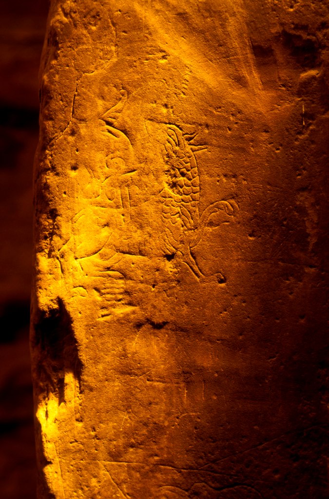 Mais de 30 inscrições rúnicas, assim como um dragão e outros animais foram encontradas entalhados nas paredes. Datam do séc. 12, atribuídas a um grupo de Nórdicos que entrou no monumento para abrigar-se de uma tempestade. Este grupo poderia ter levado quaisquer restos e/ou objetos de valor que ali houvesse: parte do grafite rúnico menciona um grande tesouro encontrado no local e outro enterrado ali perto. Não se encontrou nenhuma evidência disso, mas também não sabemos que tipo de coisa podia ser chamada de tesouro por uma civilização ancestral. Embora seja basicamente equivalente a pichação, trata-se da maior coleção de tais inscrições no mundo. Fico pensando se daqui a 5.000 anos arqueólogos vão encontrar os nomes que pessoas gravam em monumentos (vandalismo, na verdade) e consagrá-los como arte ancestral.