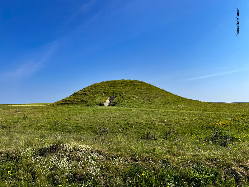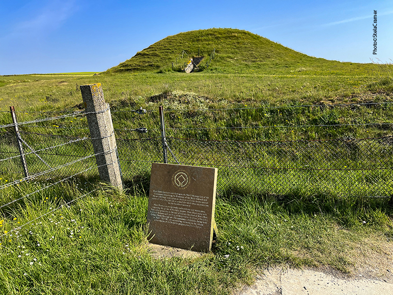 Maeshowe é uma das maiores tumbas em Orkney, embora por fora pareça apenas um monte de grama./ Maeshowe is one of the largest tombs in Orkney, although from the outside it looks just like a large grassy mound.