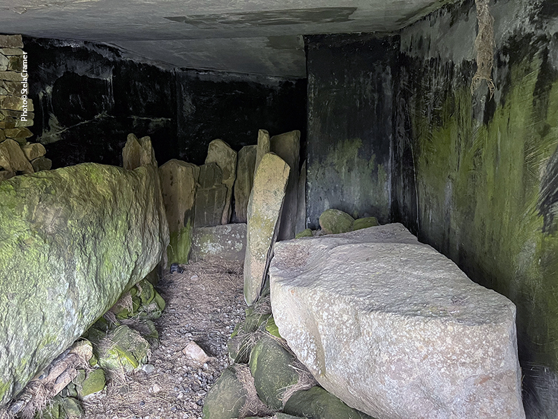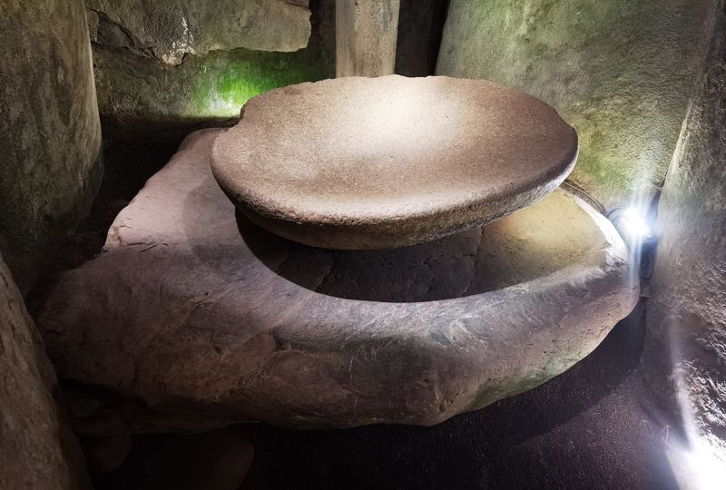 Em cada câmara há uma bacia de pedra achatada, onde ossos dos mortos eram depositados. Escavações revelaram ossos humanos , alguns queimados, indicando que corpos foram postos ali, alguns tendo sido cremados. A bacia na parede do fundo também é iluminada pelo sol no Solstício de Inverno. / Each chamber has a large flat basin stone where the bones of the dead may have been deposited during prehistoric times. Excavations have revealed deposits of human bone in the passage, indicating corpses had been placed within it, some of whom had been cremated. The Winter Solstice sunlight shines on the basin at the end wall too.
