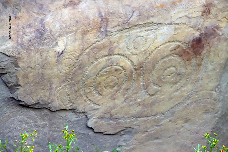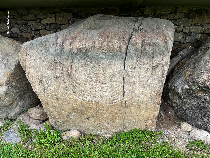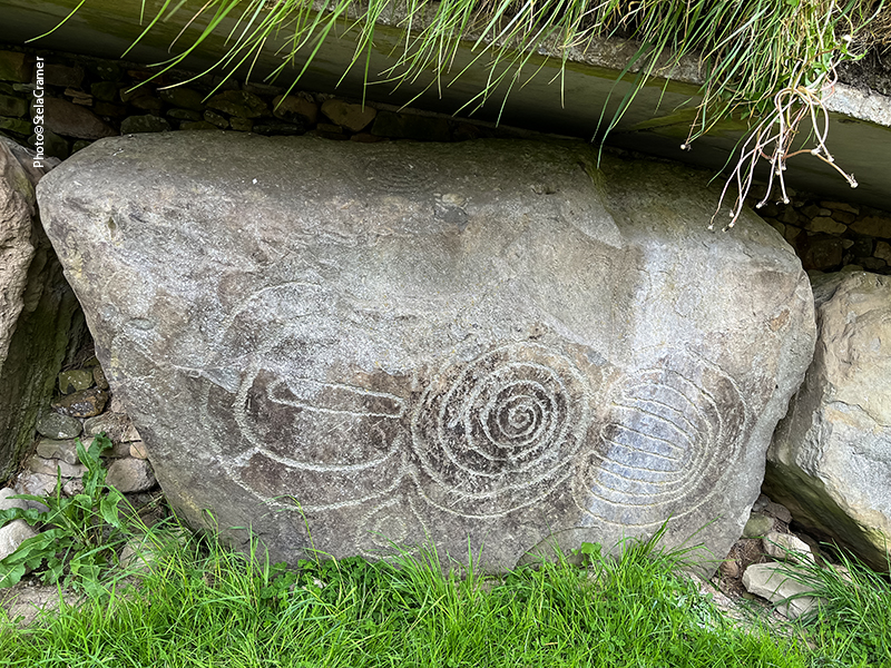 The artwork found in this cairn are extremely important.In the south-west end cell, a decorated lintel bears two pecked ‘eyebrow’ motifs (a pair of cup-marks under double arcs).
