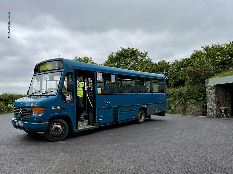 My hotel was next door to Tourist Information Office, so I went there to ask about transport to Brú na Bóinne Visitor Centre, where the Newgrange/ Knowth tours start. Apparently it was not so easy, because after ten minutes perusing bus schedules the clerk hadn’t got an answer yet. Then my answer just walked in! A guy (who knew all the ladies there) came to leave his just printed contact cards. He had retired an was starting in the taxi business, being positively surprised when I looked at him and said: “ I’ll be your first client!” We arranged for next day a visit to some places of interest ( Monasterboice and Mellifont Abbey), ending at the Visitor’s Centre, where he would leave me. My visit was scheduled for 2 p.m.; I had bought the ticket online at the website (link above shuttle picture) two months before. You can’t go to Newgrange on your own. Visitors are brought via shuttle bus to these monuments and pre-booking tickets is essential. The shuttle takes groups of 16 people, first to Knowth (giving you around half an hour to visit it) and eventually to Newgrange itself.