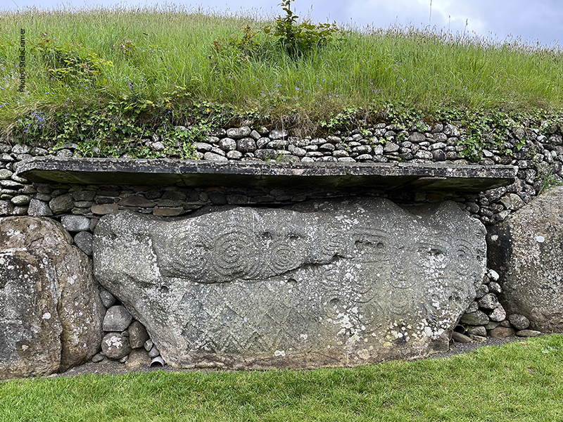Bem em cima da entrada fica a “caixa do telhado”, através da qual o sol nascente no Solstício de Inverno brilha através da longa entrada, iluminando por cerca de 17 minutos a câmara central e os entalhes no interior, como a espiral tripla ( Triskele) na parede. / The “roofbox” , directly above the main entrance, through which the Winter Solstice rising sun shines directly along the long passage, illuminating the inner chamber (for approximately 17 minutes) and revealing the carvings inside, notably the triple spiral ( Triskele) on the front wall of the chamber.