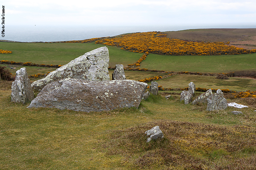 VIsta norte de Meayll Stone Circle, no alto do monte Mull, na direção de Port Erin / Meayll Stone Circle on top of Mull Hill, looking north towards Port Erin