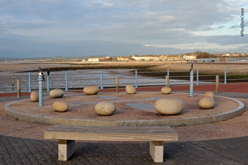 Instalação de arte no molhe: jogo de Amarelinha. Você pode pular os ovos de pedra, ou sentar-se neles. / Jetty Art: Magpie Hopscotch – Hop and jump or simply sit on one of the stone eggs