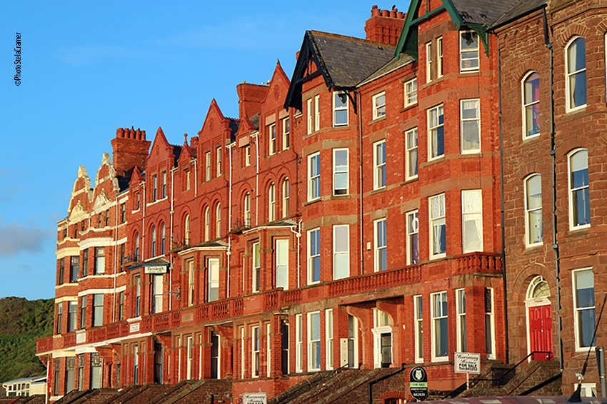 As construções mais antigas de Peel são de arenito avermelhado. O Fernleigh é o penúltimo edifício à esquerda na foto. Nosso quarto era no terceiro andar, bem de frente para o mar… e o castelo!