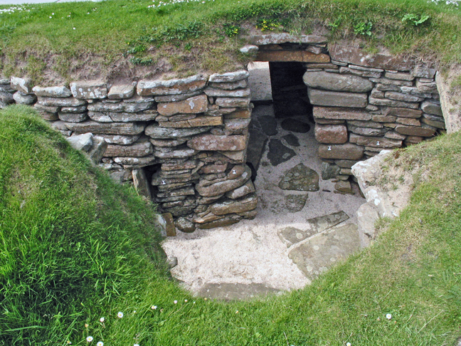 The village consisted of several one-room dwellings, each 40 square metres (430 sq ft) average rectangle with rounded corners, entered through a low, narrow doorway that could be closed by a stone slab. All houses are well-built of closely-fitting stone slabs. They were set into large mounds of midden (household refuse) and linked by passages. Research shows that the passages were covered at some point, providing the houses with more stability and insulation against Orkney’s harsh winter climate (earth-sheltering).